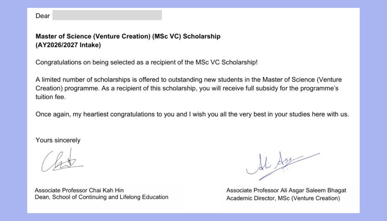 Không chỉ mang đến cơ hội học tập độc đáo, chất lượng, Khoa NUS SCALE – nơi giảng dạy chương trình Master of Science in Venture Creation còn cấp học bổng quốc tế đến 100% học phí.